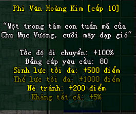 - 1 phi vân thần mã - 1 tín vật môn phái - 5 võ lâm mật tịch - 5 tẩy tuỷ kinh |